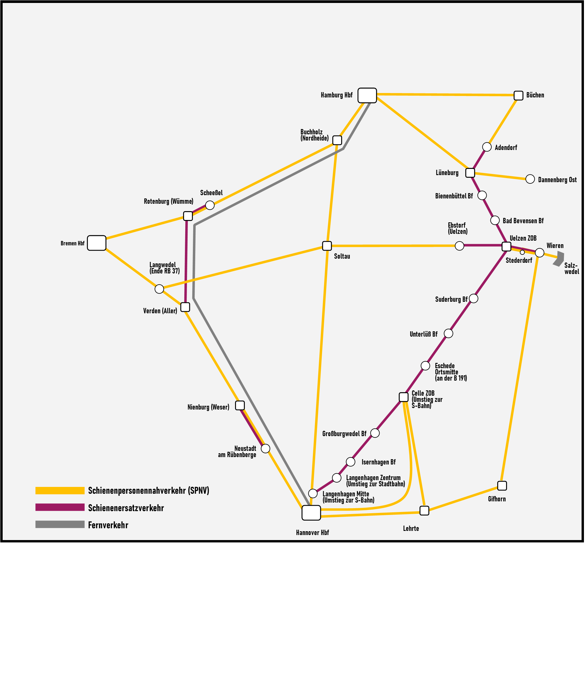 - Die Linien RE 2 und RE 3 werden zwischen Lüneburg, Uelzen, Celle und Hannover durch einen Bus-Ersatzverkehr (SEV) bedient.